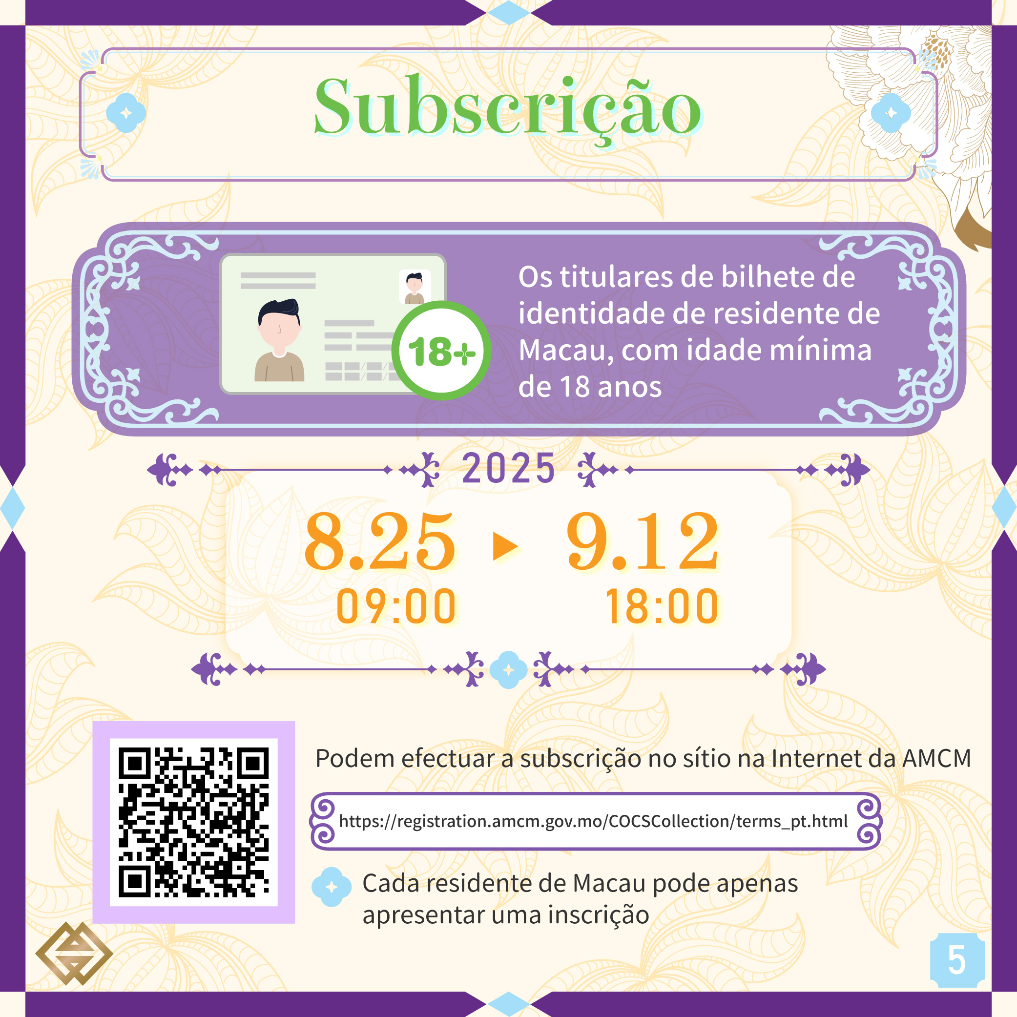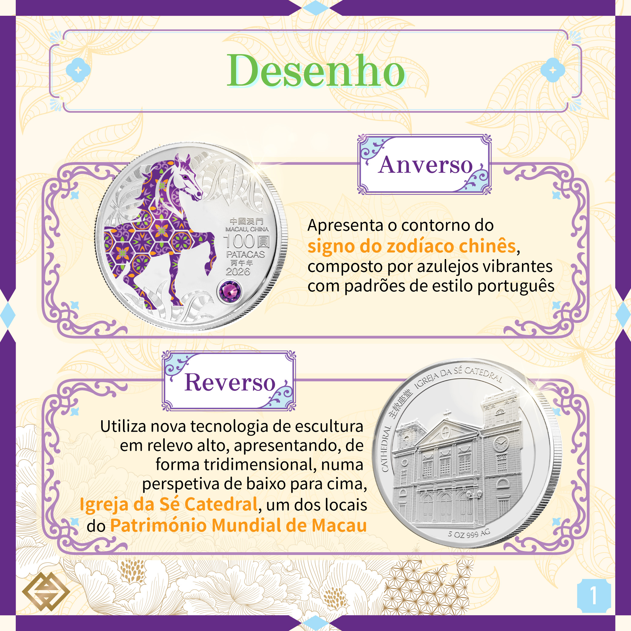 As moedas comemorativas do Ano Lunar do Cavalo são constituídas por uma moeda de prata “proof” de 1 onça, uma moeda de prata “proof” de 5 onças e uma moeda de ouro “proof” de 0,5 onça. Nas situações de excesso de subscrições, a atribuição será realizada mediante sorteio, via sistema informático. Os resultados do sorteio serão comunicados por SMS, em 19 de Setembro de 2025. Após a subscrição, os subscritores podem consultar os resultados do sorteio, no Sistema do serviço de subscrição “on-line” das moedas comemorativas da AMCM(https://registration.amcm.gov.mo/COCSCollection/terms_pt.html), a partir desse dia.