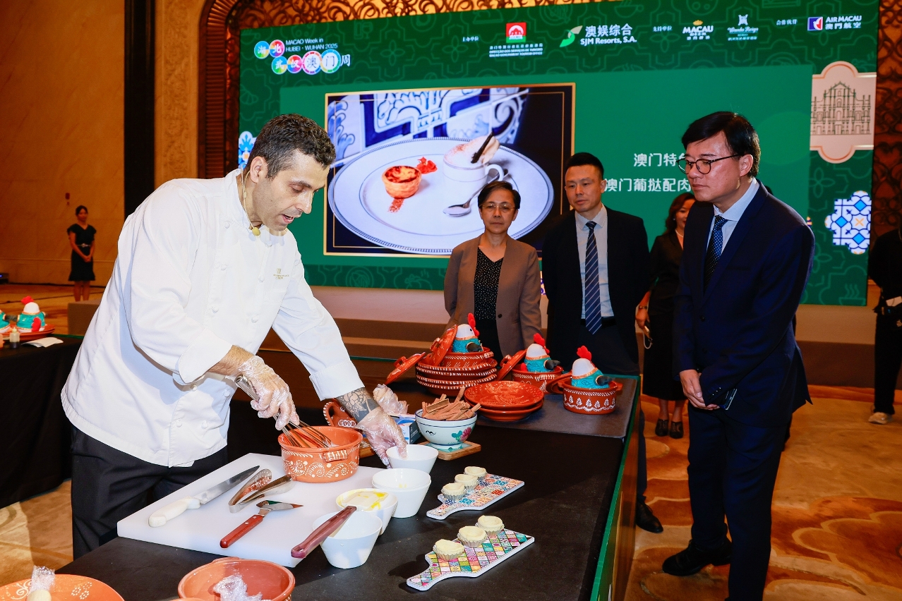 A actividade de promoção gastronómica da “Semana de Macau em Wuhan • Hubei” tem como tema “Sabores de Wuhan e Macau”. Entre 5 de Setembro e 8 de Outubro, no Hotel Wanda Reign Wuhan, será servido um buffet com pratos típicos macaenses e portugueses. A SJM enviou dois chefes de cozinha, Herlander Fernandes e Pedro Miguel Santos do Carmo, a Wuhan, para incluírem no menu do buffet vários pratos típicos macaenses e portugueses, tais como salada de polvo, caldo verde, galinha africana, arroz de minchi de porco, serradura, entre outros. Os chefs trocaram receitas e impressões sobre a cultura gastronómica com a equipa de cozinheiros do Hotel Wanda Reign.