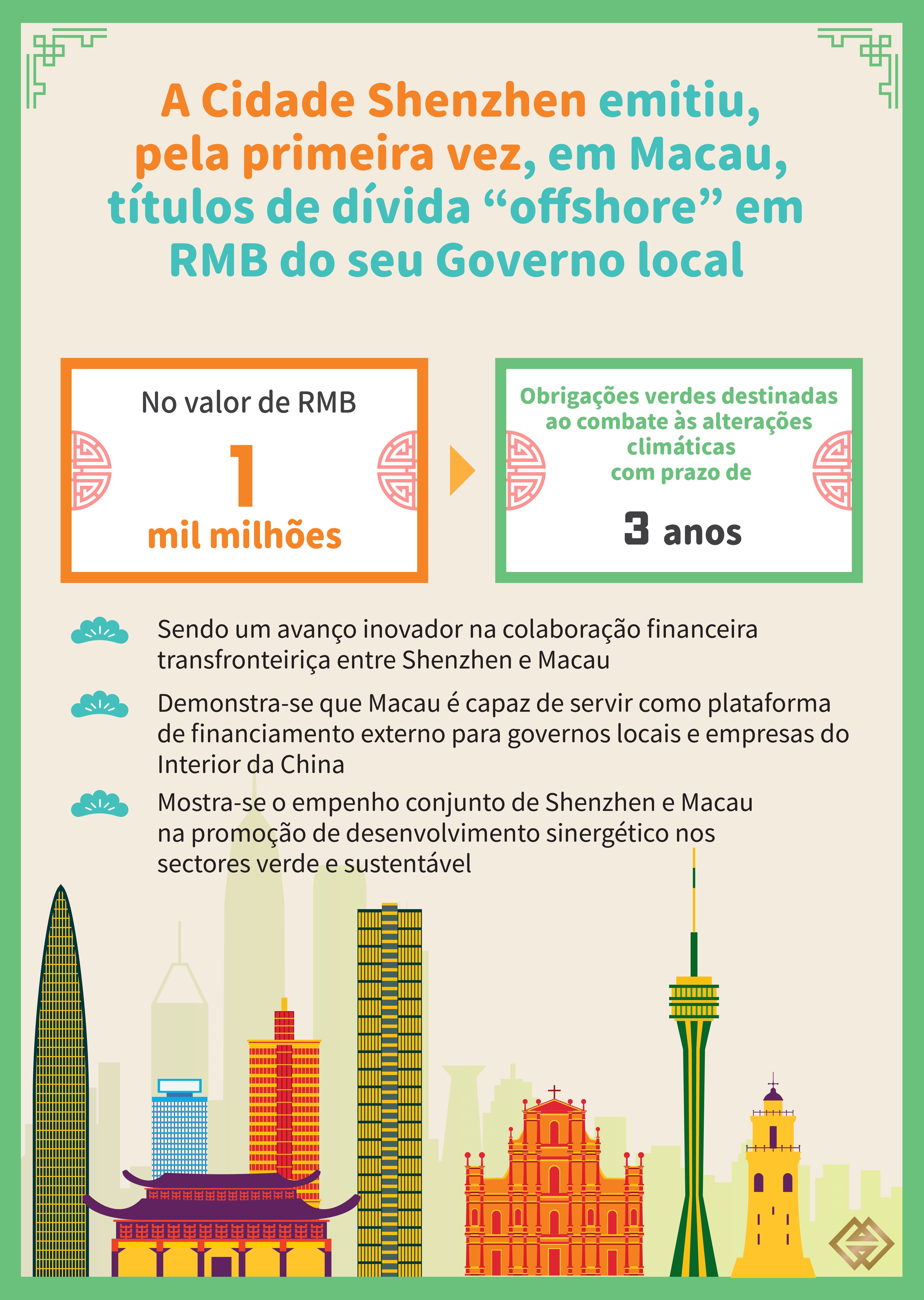 Esta emissão destina-se a investidores profissionais, envolvendo um valor de RMB 1 mil milhões, com prazo de 3 anos e uma taxa de juro de 1,74%. Por sua vez, os fundos angariados serão utilizados em projectos de transporte limpo desenvolvidos em Shenzhen, tendo as obrigações obtido o “Pre-issuance stage certificate”, emitido pela “Hong Kong Quality Assurance Agency” (HKQAA). A presente emissão de títulos de dívida do Governo local de Shenzhen foi bem acolhida pelo mercado.