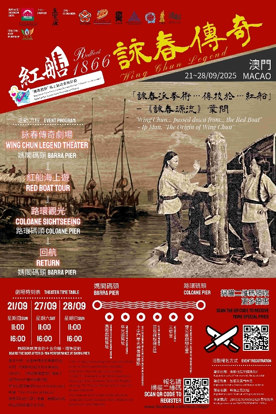 A “Redboat 1866 Wing Chun Legend” será realizada nos dias 21, 27 e 28 de Setembro, às 11h00 e às 16h00. Os participantes vão experienciar, de forma imersiva, a lendária herança da prática de artes marciais Wing Chun e a sua ligação com os “barcos vermelhos”, começando com o “Teatro Legendário de Wing Chun”, na Ponte-Cais da Barra. Em seguida, embarcarão num “Barco Vermelho” que fará a ligação entre a Barra e Coloane, percorrendo vários pontos históricos dos antigos barcos vermelhos com ópera cantonense, a fim de conhecer melhor o seu passado em Macau.
