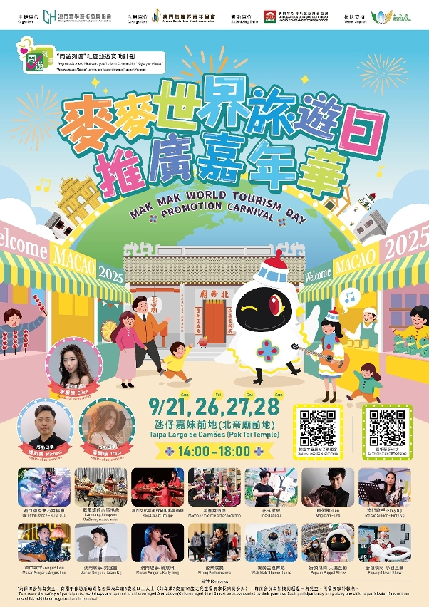 O “Mak Mak Tourism Day Promotion Carnival” terá lugar nos dias 21, 26, 27 e 28 de Setembro, no Largo de Camões (Largo do Templo Pak Tai), na Taipa. O carnaval, sob o tema “Mak Mak”, mostra a vitalidade do turismo através duma feira de produtos culturais e criativos, programas de palco, interacções na rua e workshops criativos. A “The Story Vendor x World Tourism Day Fair”, que também celebra o Dia Mundial do Turismo, organiza uma feira e teatro de marionetas na Freguesia de São Lázaro, nos dias 27 e 28 de Setembro à tarde, para mostrar a história do património mundial, produtos culturais e criativos e workshops sobre o património cultural intangível, para criar uma atmosfera animada nas zonas comunitárias através de conteúdos diversificados