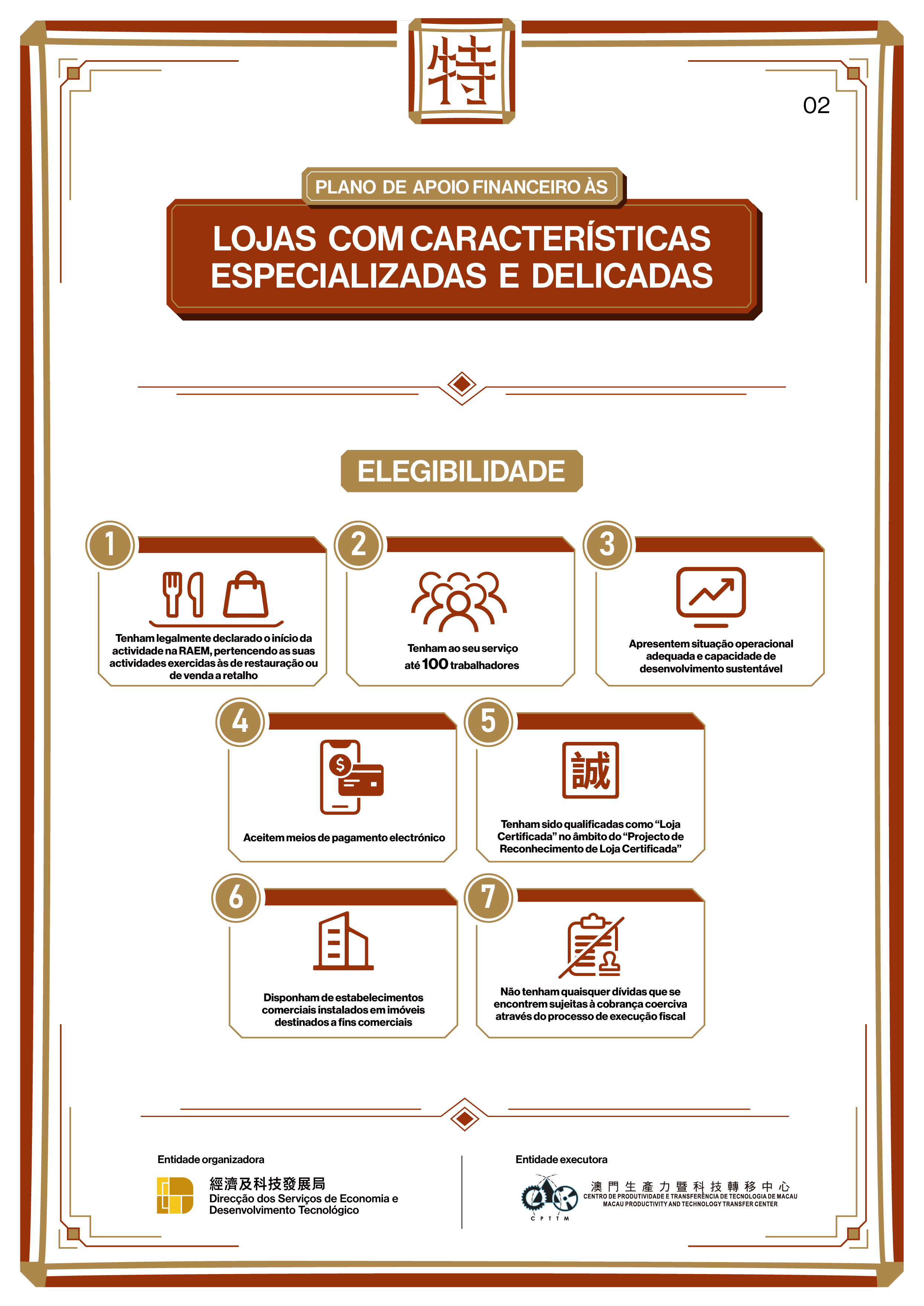 As PME classificadas como “Lojas com Características Especializadas e Delicadas” podem receber um financiamento no valor de 60% das taxas designadas relacionadas com a implementação de marketing online, criação de montras distintas e lançamento de produtos de colaboração com IP, sujeito a um limite máximo de 150.000 de patacas. Além disso, a entidade executora fornecerá aconselhamento profissional individual às “Lojas com Características Especializadas e Delicadas”, e realizará diagnóstico e melhoramento do plano de negócio e projecto de exploração.
