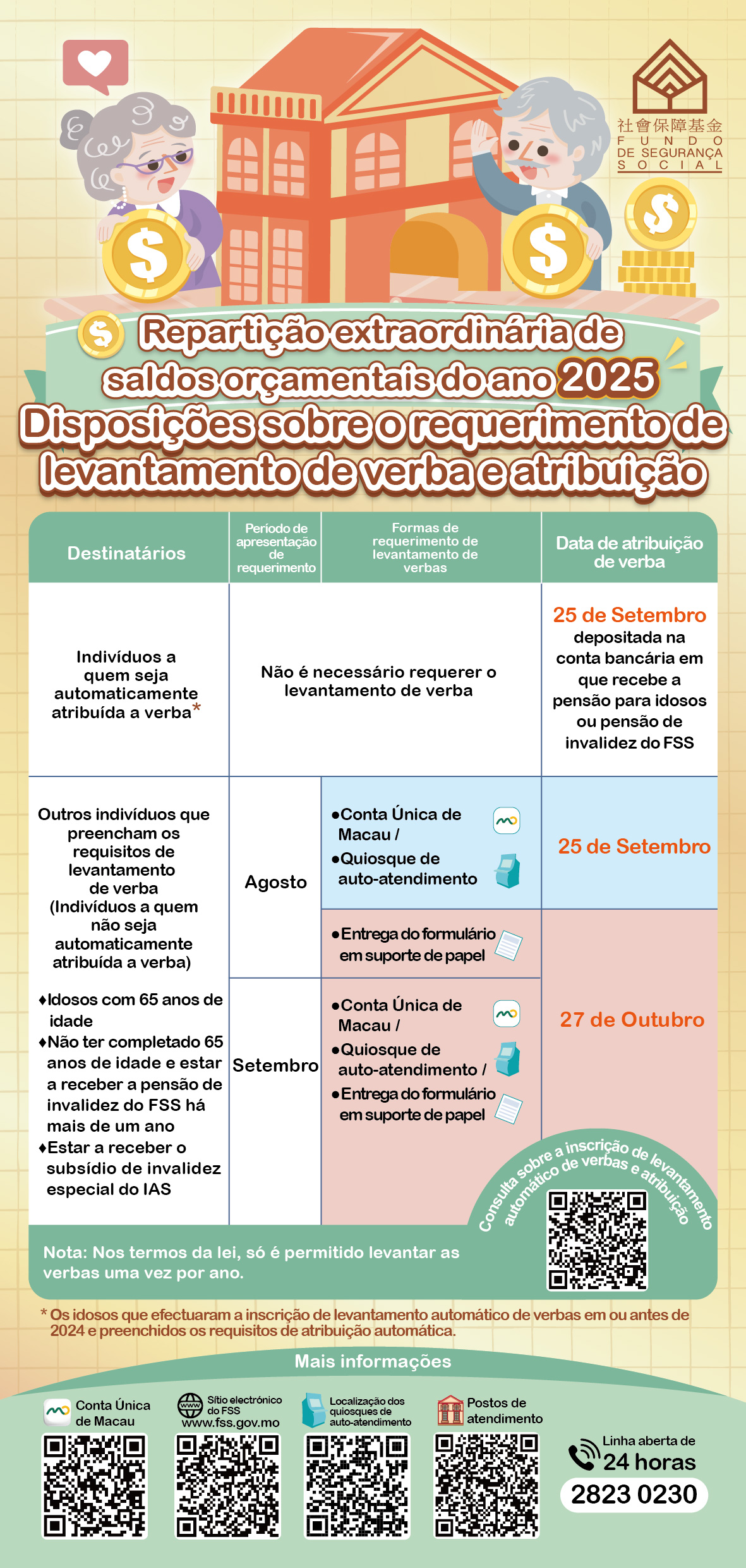O Fundo de Segurança Social lembra aos indivíduosque ainda não efectuaram a inscrição de levantamento automático de verbas, para fazer a inscrição na altura de requerimento de levantamento de verbas. Os residentes são também lembrados de estarem atentos a burlas, sendo reiterado que o FSS não vai enviar mensagens de telemóvel com ligaçãoao sítio electrónico. Para mais informações, podem visitar o sítio electrónico do FSS: https://www.fss.gov.mo/pt/sites/allocation ou contactar o FSS por via telefónica 28532850 durante o horário de expediente.