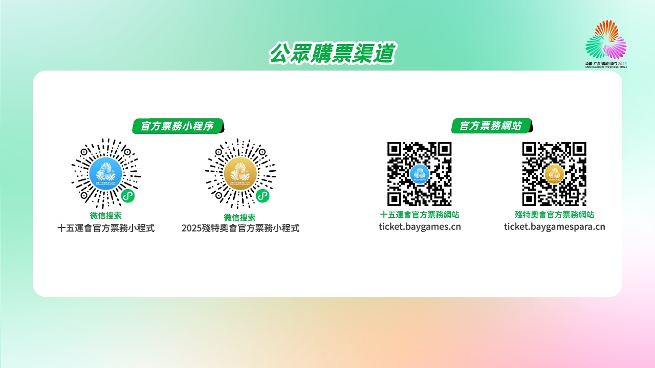 Para mais informações sobre os Jogos, queira consultar a página electrónica da Zona de Competição de Macau: www.2025nationalgames.gov.mo. Ao mesmo tempo, seguir a página do Facebook “第十五屆全運會澳門賽區” (Zona de Competição de Macau da 15.a edição dos Jogos Nacionais) e a conta oficial do WeChat “全運會殘特奧澳門賽區” (Zona de Competição de Macau dos Jogos Olímpicos Especiais para Deficientes).
