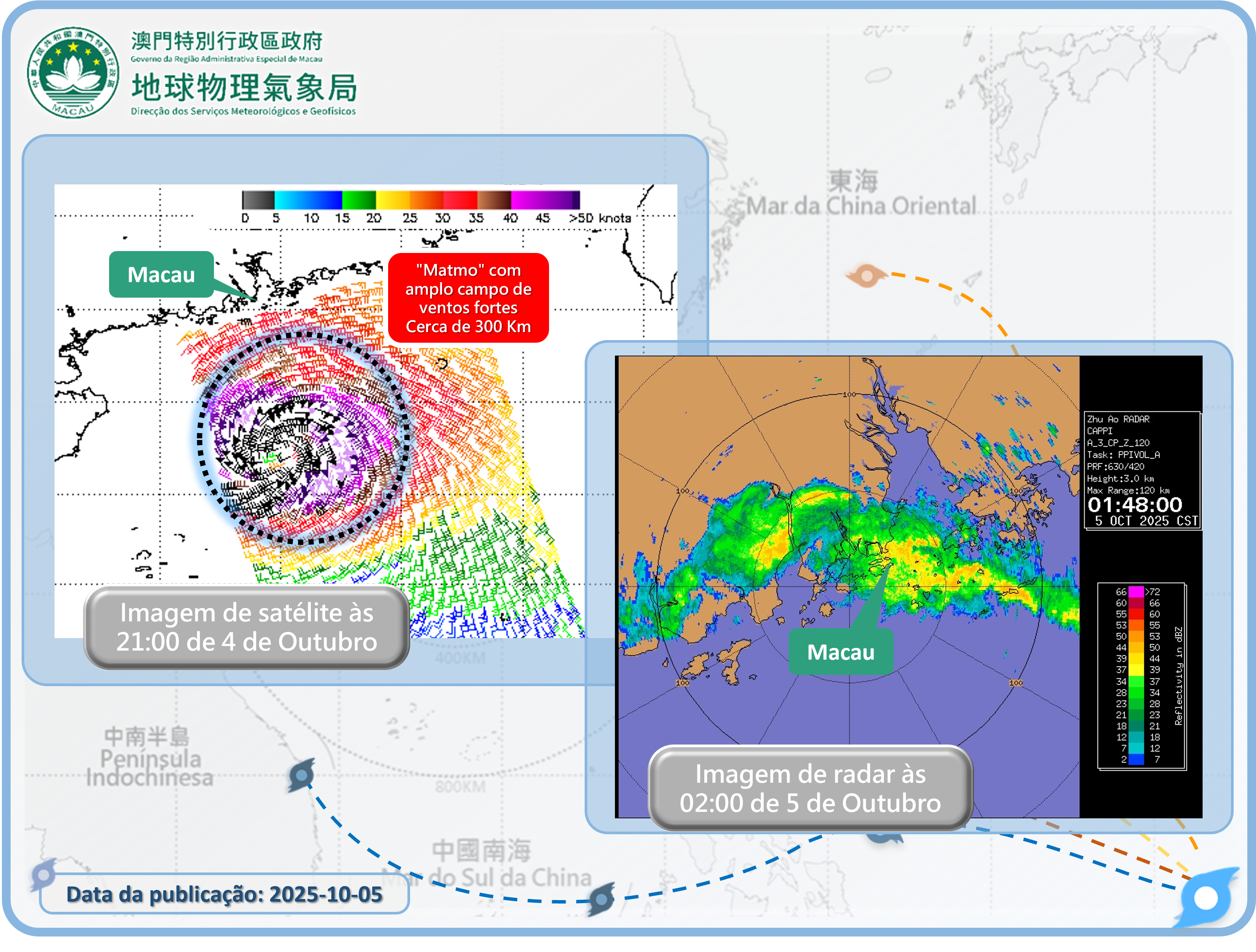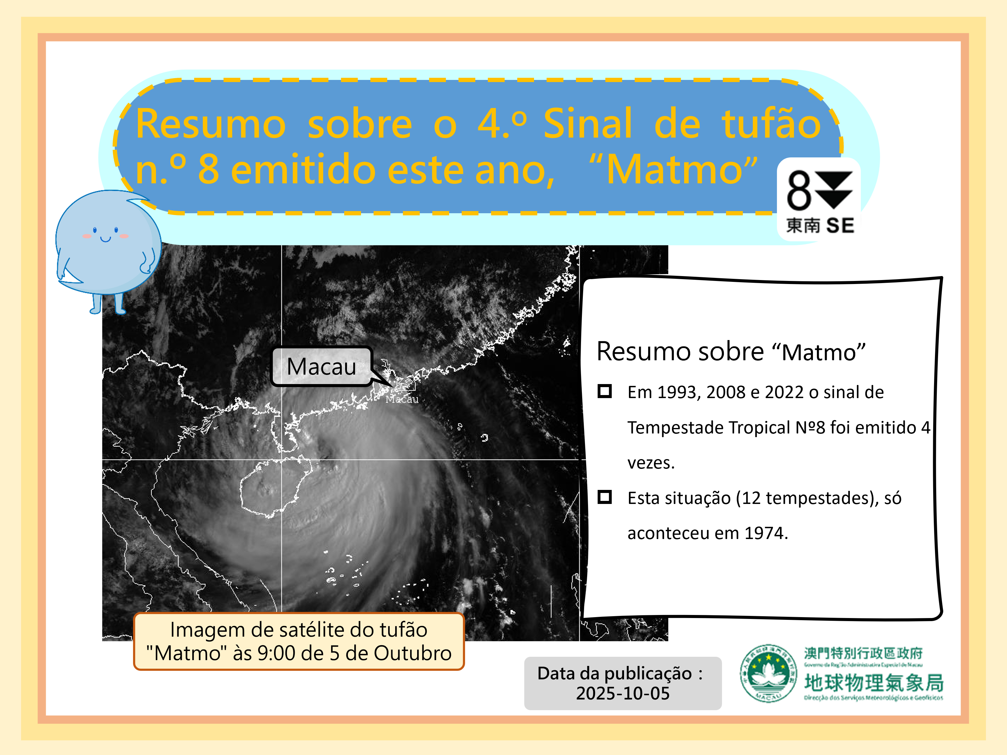 "Matmo" é a 12.ª tempestade tropical a afectar Macau este ano. Desde que há registos, esta situação ( 12 tempestades), só aconteceu em 1974. Além disso, em 1993, 2008 e 2022 foi necessário emitir quatro Sinais n.º 8 no mesma ano. (Figura 1)