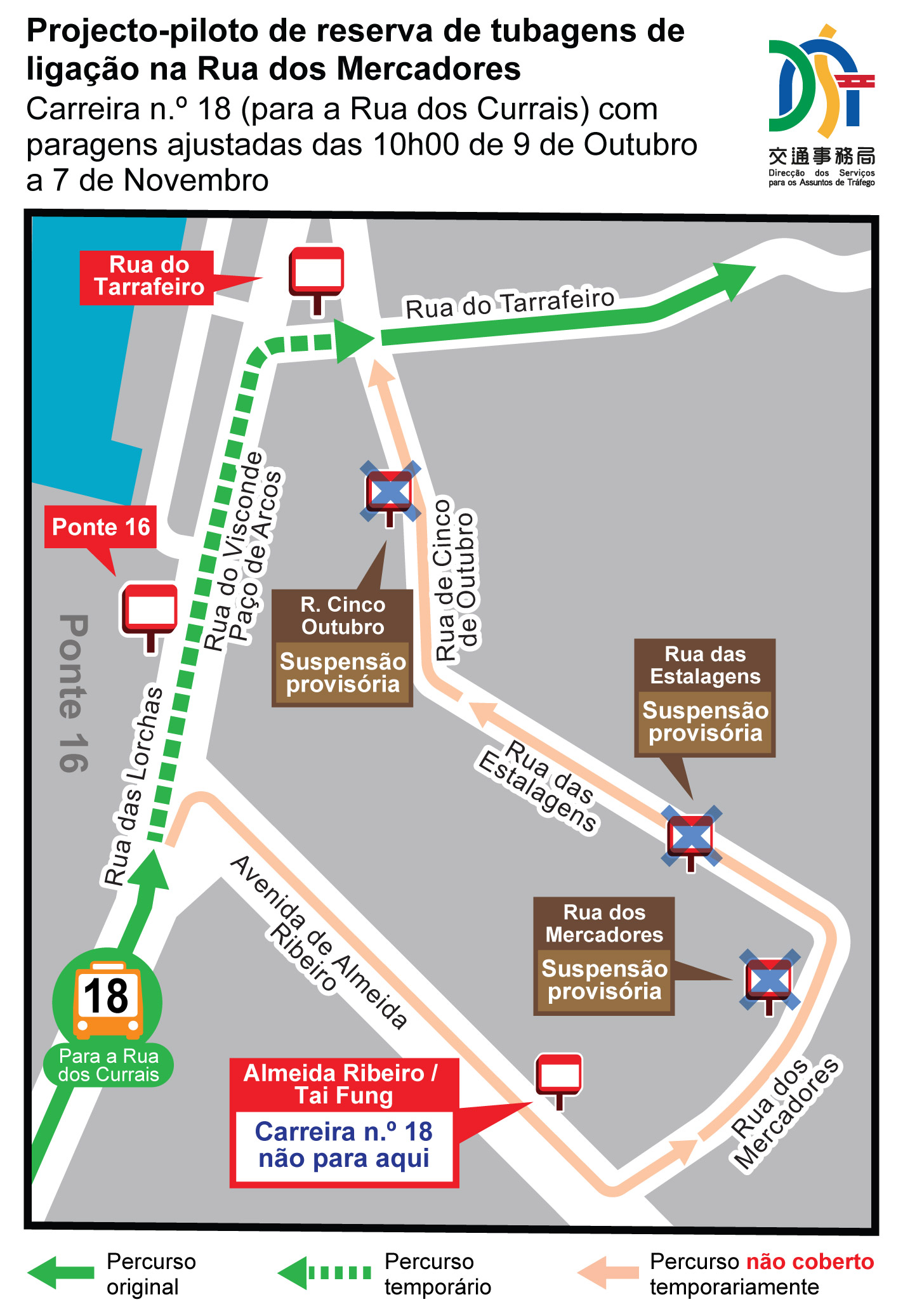 Relativamente aos autocarros, a carreira n.o 18 (para a Rua dos Currais) não fará escala nas paragens “Almeida Ribeiro / Tai Fung”, “Rua dos Mercadores”, “Rua das Estalagens” e “R. Cinco Outubro”, provisoriamente entre as 10h00 de 9 de Outubro e 7 de Novembro. Durante este período, os passageiros poderão utilizar como alternativa as paragens “Ponte 16” e “Rua do Tarrafeiro”. Para mais informações, consulte a Tabela 2, a Imagem 2 ou a página electrónica da TCM (http://www.tcm.com.mo).