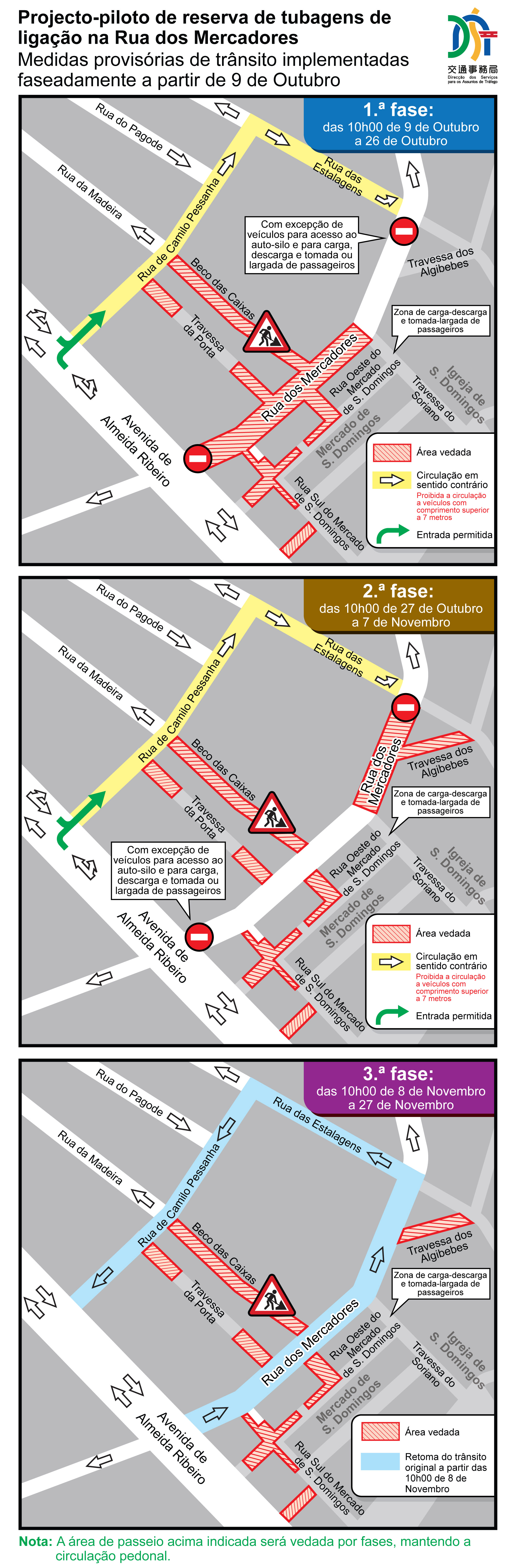 O projecto-piloto de reserva de tubagens de ligação na Rua dos Mercadores decorrerá de 9 de Outubro a 27 de Novembro. Para minimizar o impacto, e após coordenação pelo Grupo de Coordenação de Obras Viárias (adiante designado por Grupo), a intervenção será dividida em três fases. Durante a primeira fase (de 9 a 26 de Outubro) e a segunda fase (de 27 de Outubro a 7 de Novembro), a Rua dos Mercadores será encerrada ao trânsito de forma faseada. Paralelamente, alguns troços da Rua de Camilo Pessanha e da Rua das Estalagens serão convertidos para sentido contrário, assegurando assim o acesso de veículos para operações de carga e descarga, tomada e largada de passageiros e entrada e saída de parque de estacionamento, mantendo a circulação rodoviária na área. O Corpo de Polícia de Segurança Pública (CPSP) destacará agentes para regular o trânsito e garantir a ordem durante estas operações. A terceira fase (de 8 a 27 de Novembro) concentrar-se-á nas vias internas da área. Consequentemente, a Rua dos Mercadores, a Rua das Estalagens e a Rua de Camilo Pessanha, anteriormente vedadas ao trânsito e em sentido contrário, serão reabertas ao trânsito a partir das 10h00 de 8 de Novembro (consulte Tabela 1 e Imagem 1 em anexo para detalhes).