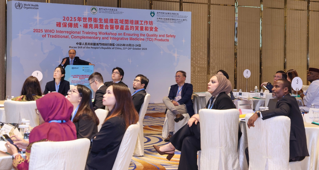 No âmbito das comemorações do "Dia Mundial da Medicina Tradicional", foi realizada, no dia 22 de Outubro, a cerimónia de abertura do "Workshop de Formação Inter-Regional da Organização Mundial de Saúde 2025 e das actividades comemorativas do 10.º aniversário do estabelecimento do Centro de Cooperação de Medicina Tradicional da Organização Mundial de Saúde (Macau)". A actividade é organizada pela Organização Mundial de Saúde (OMS), contando com a organização do Governo da Região Administrativa Especial de Macau. A cerimónia de inauguração contou com a participação de cerca de 100 pessoas, incluindo o director do Departamento de Propaganda e Cultura do Gabinete de Ligação do Governo Popular Central na RAEM, Wan Sucheng, o director do Departamento Geral do Comissariado do Ministério dos Negócios Estrangeiros da República Popular da China na Governo da Região Administrativa Especial de Macau (RAEM), Guo Xiaofeng, o chefe da Divisão de Medicina Tradicional, Complementar e Integração da OMS, Kim Sungchol, a assessora do Gabinete da Secretária para os Assuntos Sociais e Cultura do Governo da RAEM, Lu Hong, o director substituto dos Serviços de Saúde, Cheang Seng Ip, o presidente do Instituto para a Supervisão e Administração Farmacêutica, Choi Peng Cheong, o director substituto do Centro Hospitalar Conde de São Januário dos Serviços de Saúde, Tai Wa Hou, a directora do Hospital Kiang Wu, Ung Pui Kun, a directora do Centro de Cooperação de Medicina Tradicional da OMS (Macau), Mo Hui, os representantes e consultores da OMS, bem como os membros do Conselho para os Assuntos Médicos e representantes das associações de medicina tradicional chinesa de Macau.