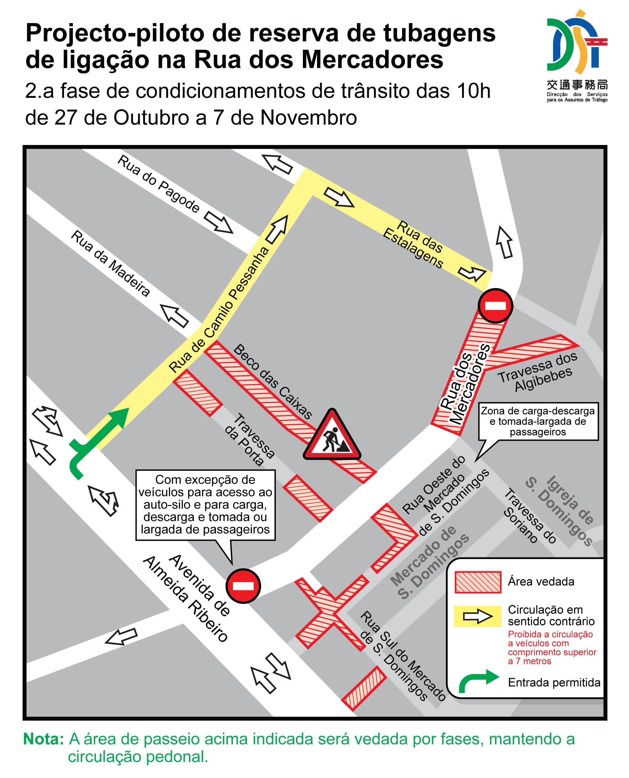 O projecto-piloto de reserva de tubagens de ligação na Rua dos Mercadores arrancou a 9 de Outubro. Em articulação com o andamento das obras, decorrerá a 2.ª fase de 27 de Outubro a 7 de Novembro (com uma duração total prevista de 12 dias). Durante este período, será encerrado ao trânsito o troço da Rua dos Mercadores compreendido entre a Travessa do Soriano e a Rua das Estalagens. O troço entre a Travessa do Soriano e a Avenida de Almeida Ribeiro estará igualmente encerrado, permitindo, no entanto, o acesso a parques de estacionamento e o trânsito para operações de carga-descarga e tomada-largada de passageiros através da Avenida de Almeida Ribeiro. Além disso, permanecerá em vigor a circulação em sentido inverso em alguns troços da Rua de Camilo Pessanha e da Rua das Estalagens, de modo a garantir a circulação rodoviária na área. Concluída a 2.ª fase, serão levantadas as medidas de encerramento ao trânsito. A 3.ª fase (de 8 a 27 de Novembro) concentrará os trabalhos nos arruamentos internos da zona. Por conseguinte, a circulação na Rua dos Mercadores, Rua das Estalagens e Rua de Camilo Pessanha – anteriormente sujeita a encerramento ao trânsito e a circulação em sentido inverso – será reposta a partir das 10h00 de 8 de Novembro (para pormenores, consulte https://www.dsat.gov.mo/dsat/news_detail.aspx?a_id=BFE531D406D9EF637E64B10A19E9E343).