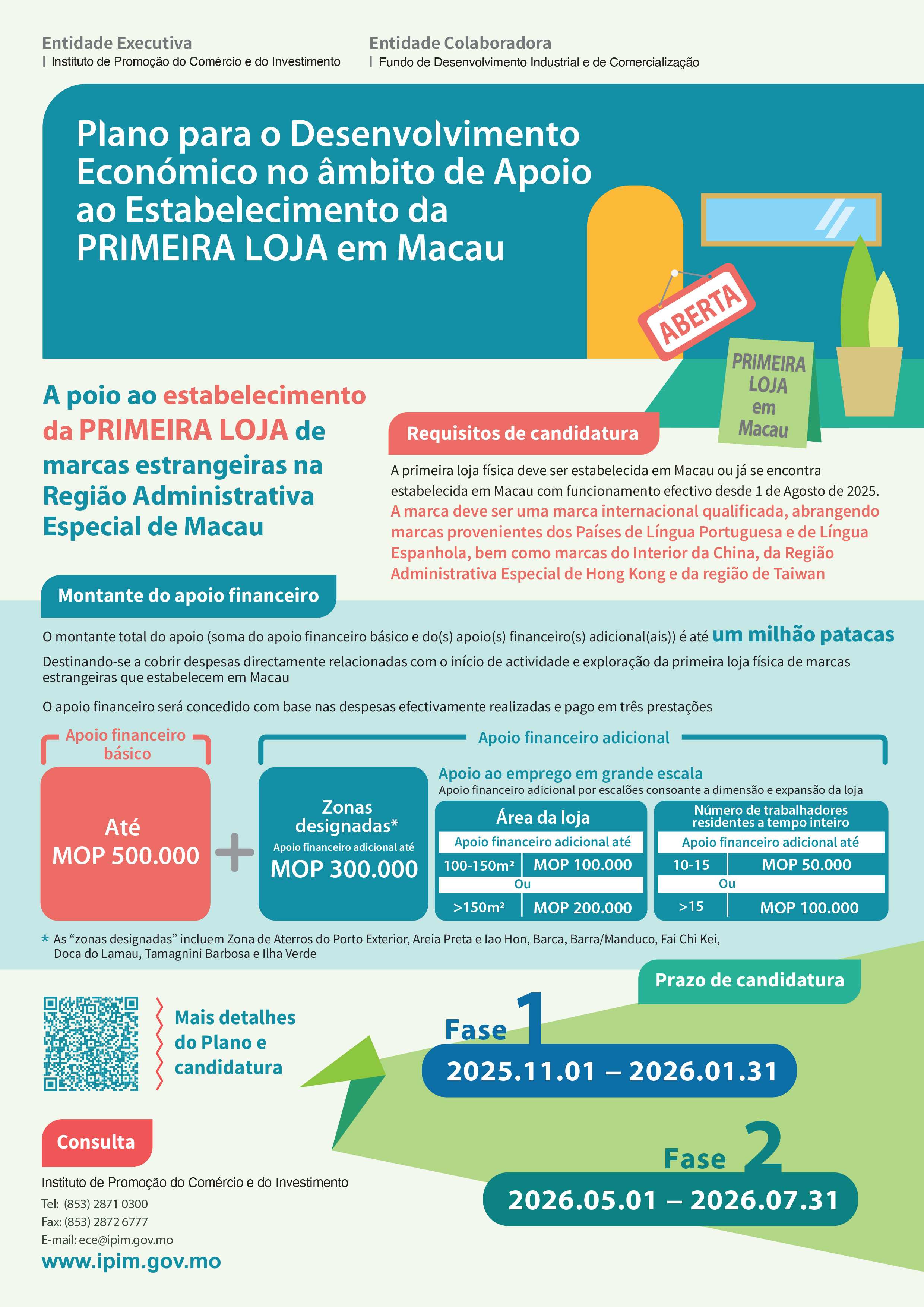 Para detalhes completos sobre o Plano, os interessados podem consultar a página electrónica do IPIM, em https://www.ipim.gov.mo/, digitalizar o código QR constante do cartaz promocional ou contactar o IPIM através do n.º de telefone (853) 2871 0300, durante o horário de expediente, ou por e-mail: ece@ipim.gov.mo.