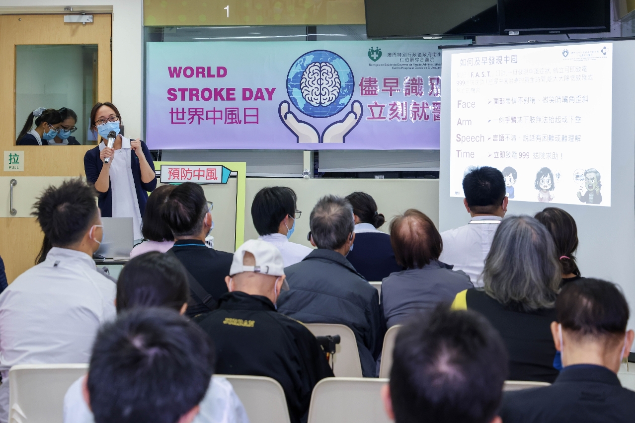 A Organização Mundial do AVC designou o dia 29 de Outubro como "Dia Mundial do AVC", o tema deste ano é "Identificação precoce, tratamento médico imediato", salientando a importância de identificar rapidamente os sintomas do AVC e procurar tratamento médico imediatamente. O AVC é uma das principais causas de morte e incapacidade em todo o mundo, sendo que as doenças cardiovasculares e cerebrovasculares são actualmente a segunda principal causa de morte em Macau. Para assinalar o "Dia Mundial do AVC" e aumentar os conhecimentos dos residentes sobre a identificação precoce de acidentes vasculares cerebrais e a prevenção de doenças, bem como promover a auto-gestão da saúde, nomeadamente a adopção de bons hábitos alimentares, a prática de exercício físico e o controlo de peso, entre outros aspetos. Recentemente, o Centro Hospitalar Conde de São Januário (CHCSJ) dos Serviços de Saúde realizou uma palestra sobre os conhecimentos de saúde relativos à prevenção do AVC destinada aos doentes e seus familiares.