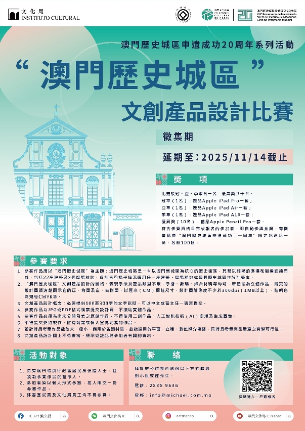 Para celebrar o 20.º aniversário da inscrição do “Centro Histórico de Macau” na Lista do Património Mundial, o Instituto Cultural (IC) lançou uma série de actividades, entre as quais se inclui o Concurso de Design de Produtos Criativos e Culturais do “Centro Histórico de Macau”. A fim de incentivar a participação de mais residentes e promover conjuntamente o valor e a conotação do património cultural, o prazo de inscrição será agora prorrogado até 14 de Novembro. Todos os interessados são convidados a participar activamente, recebendo cada participante que submeta com sucesso a sua obra uma lembrança comemorativa de edição limitada.