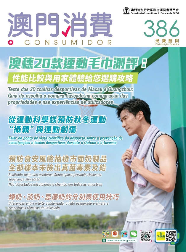 Atendendo à tendência de desenvolvimento da integração de consumo na Grande Baía Guangdong-Hong Kong Macau, os Conselhos de Consumidores de Macau e de Guangzhou cooperam para realizar um teste comparativo à qualidade das 20 toalhas desportivas amostradas, cujo relatório já se encontra publicado na nova edição do boletim “O Consumidor”, no sentido de dar referências aos consumidores em relação à escolha das mesmas. Esta edição do “Consumidor” (n.º 386) apresenta ainda as precauções sobre os cuidados a ter ao fazer exercício físico durante o Outono e o Inverno.