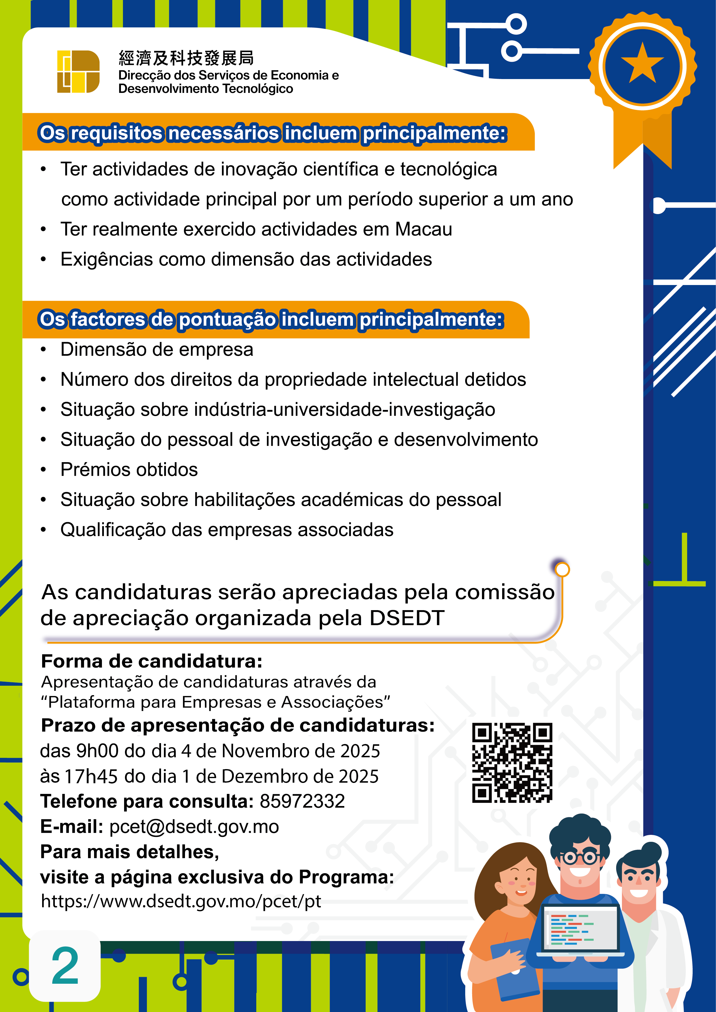 O prazo de candidatura desta ronda decorrerá entre 4 de Novembro e 1 de Dezembro de 2025, podendo os interessados apresentar as suas candidaturas através do sistema de candidatura online da “Plataforma para Empresas e Associações”. O Governo da RAEM tem prestado sucessivamente apoio às empresas tecnológicas certificadas em vários aspectos, tais como capital, quadros qualificados e emparelhamento. Para conhecer os pormenores da candidatura e as respectivas medidas de apoio, podem consultar a página exclusiva do Programa (https://www.dsedt.gov.mo/pcet/pt/index.jsp) ou ligar para o n.º de telefone 8597 2332.