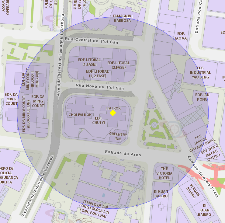 • A área de risco com um raio de 100 metros, delimita o Edifício Chui Yi (I Fai Kok), situado no Istmo de Ferreira do Amaral