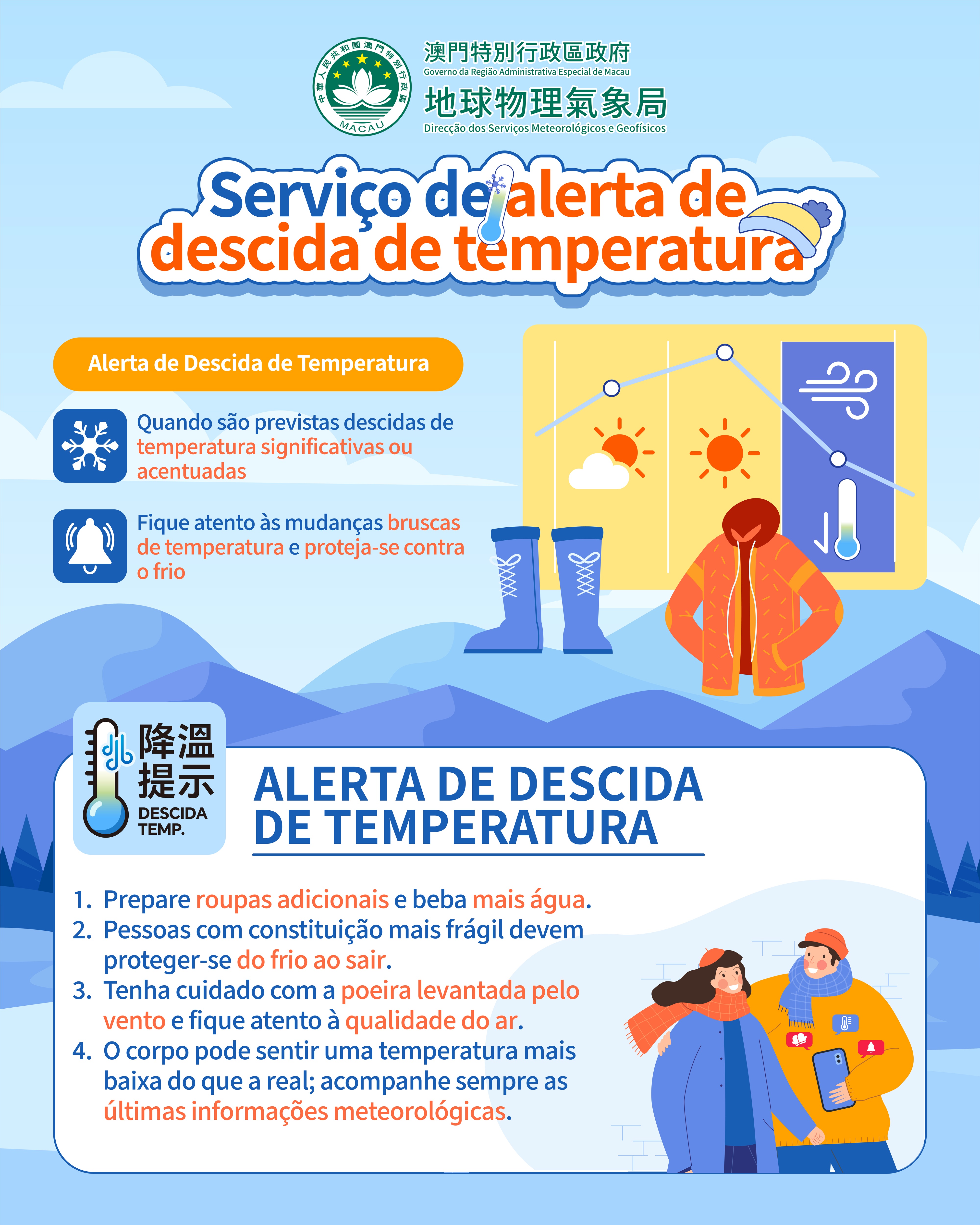 A fim de melhorar ainda mais o serviço de alerta relacionado com a temperatura, a DSMG lançou, hoje, 10 de Dezembro de 2025, dois novos serviços, incluindo a prestação de serviços de "Alerta de Descida de Temperatura" e de " Informação sobre Temperatura Sentida (Sensação Térmica)". O "Alerta de Descida de Temperatura" ajuda os cidadãos a dominarem as mudanças rápidas da temperatura a curto prazo, e a "Informação sobre Temperatura Sentida" permite aos cidadãos dominarem as informações meteorológicas em tempo real mais próximas da sua percepção física. Ao mesmo tempo, foram optimizados e estão mais intuitivos e claros, os ícones para alertas de tempo frio e quente.
