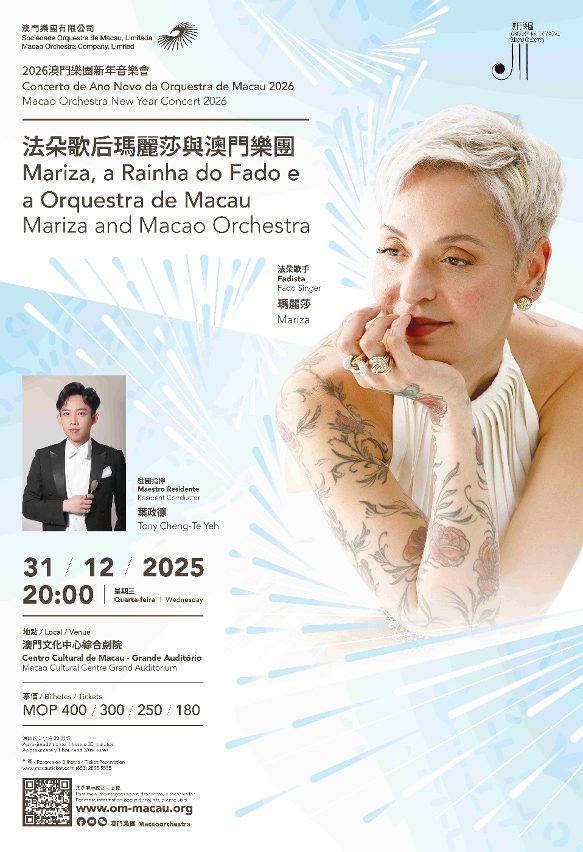 O Concerto de Ano Novo da Orquestra de Macau 2026 “Mariza, a Rainha do Fado e a Orquestra de Macau” terá lugar no dia 31 de Dezembro, pelas 20:00 horas, no Centro Cultural de Macau - Grande Auditório. A fadista Mariza irá actuar ao vivo com a orquestra, interpretando, com a sua voz profundamente emotiva, uma selecção de fados icónicos e proporcionando ao público uma experiência musical que transcende géneros e fronteiras espaciais e temporais.