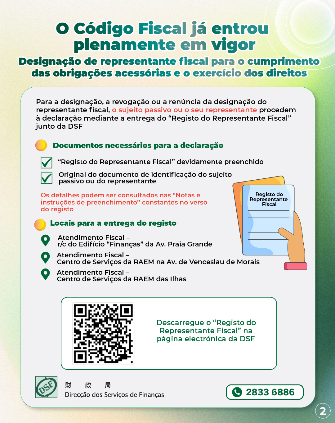 A designação do representante fiscal deve ser expressamente aceite pelo próprio. A designação, a revogação ou a renúncia da designação do representante fiscal, tornam-se eficazes quando o sujeito passivo ou o representante procedem à declaração mediante a entrega do “Registo do Representante Fiscal”. O respectivo registo pode ser descarregado na página electrónica da DSF (https://www.dsf.gov.mo/zh-hant/all-download), e no acto da entrega deve ser exibido o original do documento de identificação do sujeito passivo ou do representante. Para mais informações sobre os documentos necessários, podem ser consultadas as “Notas e instruções de preenchimento” constantes no verso do mesmo, e, após o seu devido preenchimento, pode ser entregue durante o horário de expediente, em qualquer um dos seguintes postos de atendimento da DSF: