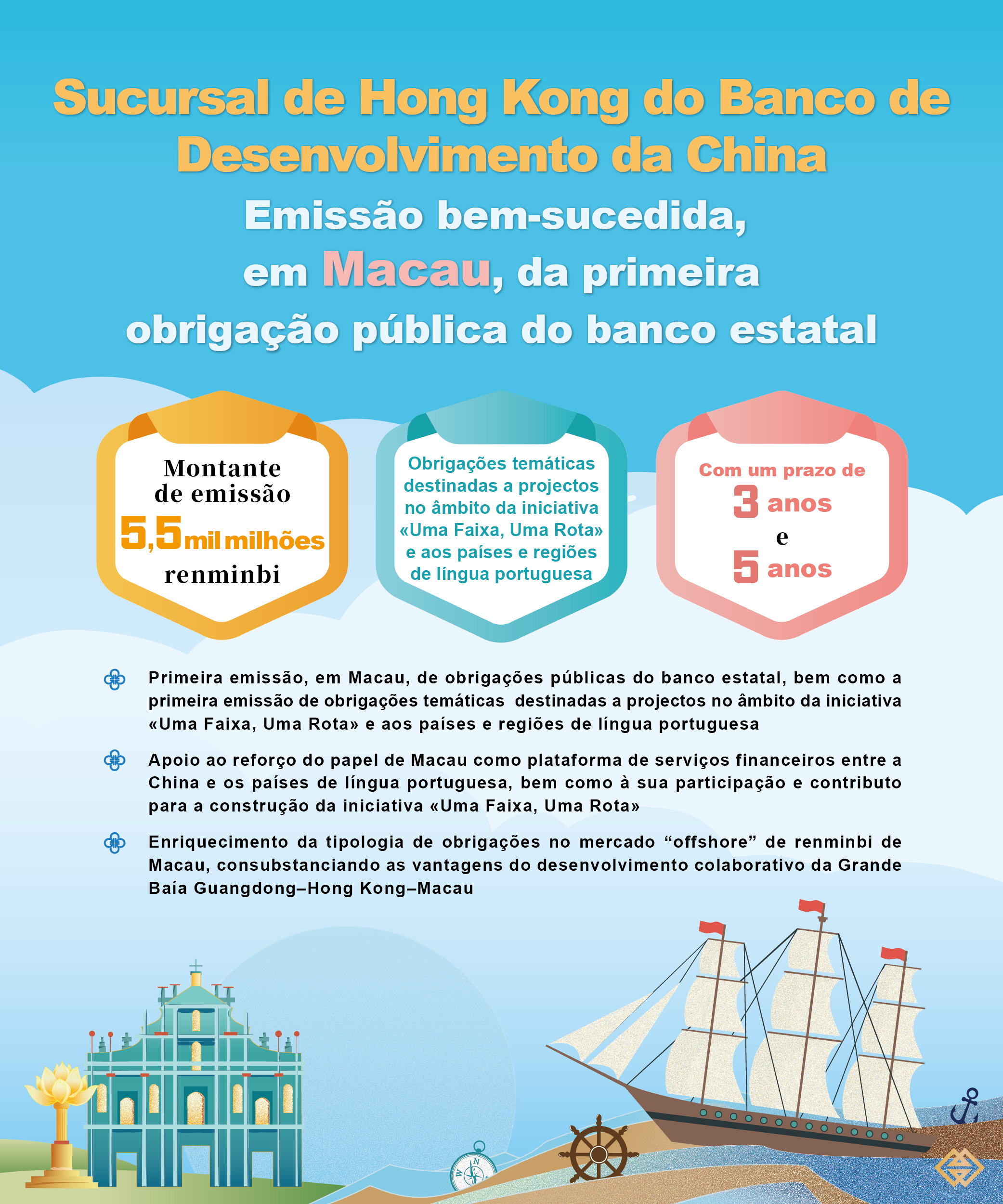 A primeira emissão, em Macau, de obrigações públicas do banco estatal pela Sucursal de Hong Kong do Banco de Desenvolvimento da China, bem como a primeira emissão de obrigações temáticas destinadas à iniciativa «Uma Faixa, Uma Rota» e aos países e regiões de língua portuguesa, representa uma importante demonstração do apoio à melhor afirmação de Macau como plataforma de serviços financeiros entre a China e os países de língua portuguesa, além de destacar a sua participação e contributo para a construção da iniciativa «Uma Faixa, Uma Rota». Paralelamente, a presente emissão contribui para o enriquecimento da tipologia de obrigações no mercado “offshore” de renminbi de Macau, consubstancia as vantagens do desenvolvimento colaborativo da Grande Baía Guangdong–Hong Kong–Macau e injecta novo dinamismo no desenvolvimento do mercado obrigacionista de Macau. Adicionalmente, esta iniciativa promove a internacionalização do renminbi, reforçando a integração e a prestação de serviços de Macau no contexto do desenvolvimento global do País.