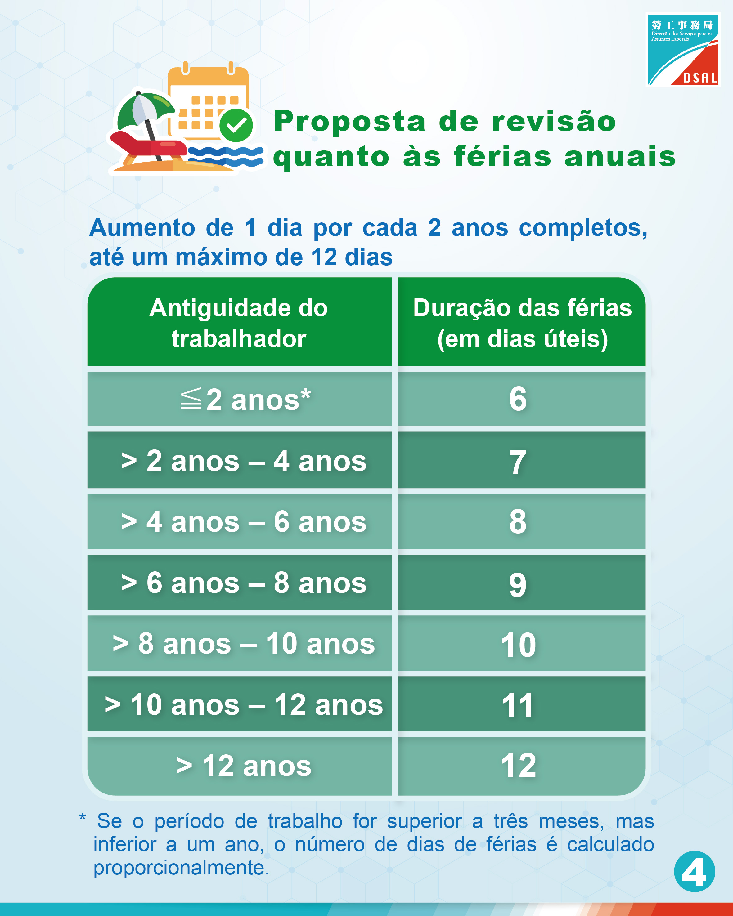 O Governo da Região Administrativa Especial de Macau (RAEM) vai realizar uma consulta pública a decorrer durante 45 dias, no período compreendido entre 31 de Janeiro e 16 de Março de 2026, sobre a alteração do número de dias de licença de maternidade e de férias anuais previstos na Lei n.º 7/2008 (Lei das relações de trabalho). O documento de consulta, propõe-se que a licença de maternidade seja aumentada para 90 dias, e que as férias anuais sejam aumentadas por antiguidade, acrescendo 1 dia útil de férias anuais por cada 2 anos completos de antiguidade, até um máximo de 12 dias úteis, no sentido de optimizar continuamente a garantia dos direitos e interesses laborais, para que os trabalhadores possam encontrar um melhor equilíbrio entre o trabalho e a vida familiar.