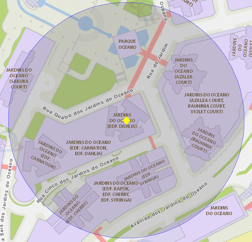 • zona de risco com raio de 100 metros nas proximidades do Edifício Dahlia, nos Jardins do Oceano, na Ilha da Taipa.