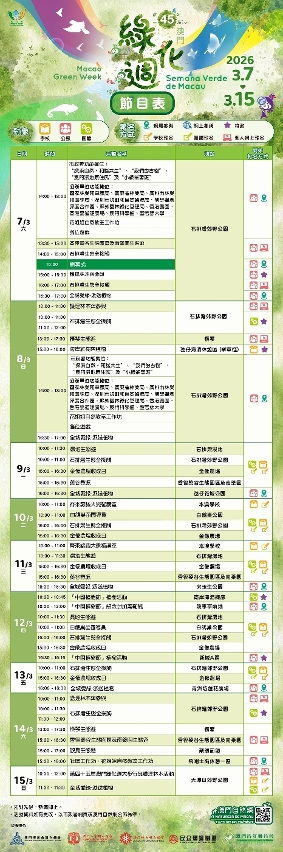 Esta edição realiza-se entre 7 e 15 de Março, ou seja, durante nove dias consecutivos. Durante a Semana Verde, há mais de 40 actividades de aproximação à Natureza, incluindo a nova actividade temática “Conhecer bem a ecologia de Seac Pai Van”, na qual vão ser apresentadas ao público novas instalações, como o Pavilhão Educativo sobre Anfíbios e Répteis, o Jardim de Observação de Aves e o Jardim de Borboletas.