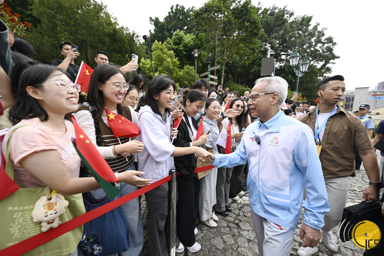 十五运会组委会和残特奥会组委会执行主任、行政长官岑浩辉与沿途观看火炬传递的市民和旅客握手问好,亲切交谈。