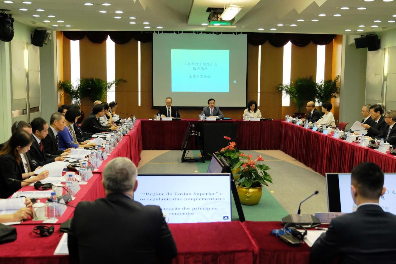 介绍会由谭俊荣司长主持,高等教育辅助办公室主任苏朝晖、副主任何丝雅、曾冠雄参加。谭司长表示,在新制度的规范下,本澳高等院校的管理将会更加严谨、课程的设置及教学将会更具弹性,同时,政府对高等院校的支持将更充足,促使院校的科研以及学术水平等得以全面提升,创设条件促进本地高等教育与国际水平接轨。