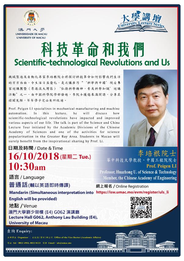澳门大学将于10月16日举行“大学讲坛”讲座,华中科技大学教授、中国工程院院士李培根将以“科技革命与我们"为题,探讨科技革命如何影响生活。欢迎有兴趣人士参加。