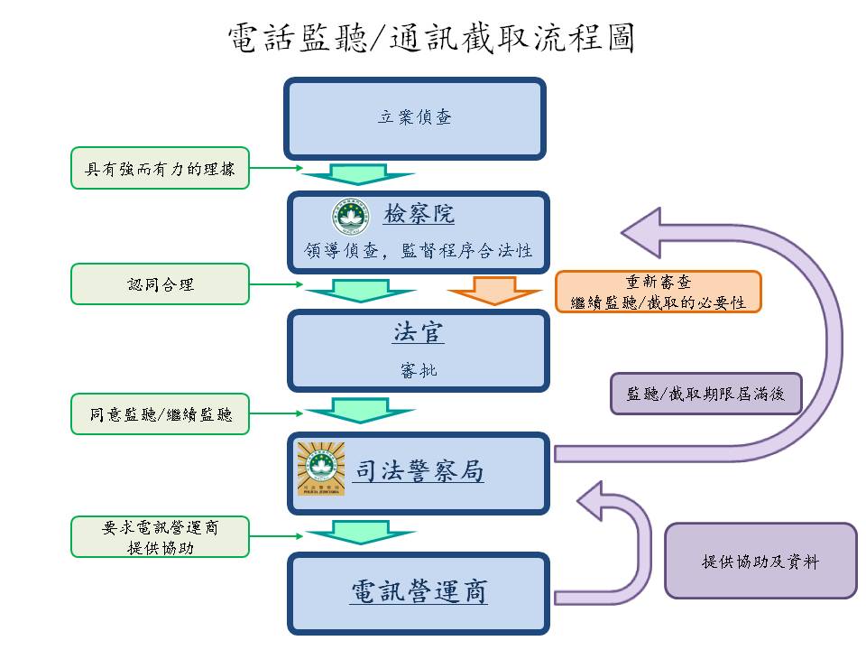 检察院承办检察官在审查刑事警察机关的报告和审视整个卷宗的案情资料后,倘认为符合刑事诉讼法的规定(包括但不限于《刑事诉讼法典》第一百七十二条的规定,因为一来检察院要监督整个程序的合法性,二来检察官必须审查是否符合补充原则(或称最后手段原则),即其他调查措施或取证方法是否能有效发现事实真相或获取证据),便会批示将整个卷宗送交刑事起诉法庭法官,由刑事起诉法庭法官依职权在检察官审查的基础上,再次审查申请是否符合实施电话监听的法律规定,当中包括合法性原则、适度及适当原则等刑事诉讼基本原则,以及电话监听所额外遵循的重罪原则、必要原则、补充原则等原则。倘所有法律要件俱备的情况下,刑事起诉法庭法官便会许可或命令在特定期间内、对特定目标实施电话监听。