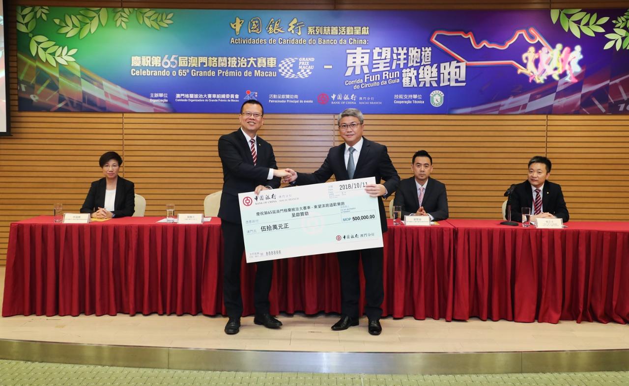 新闻发布会上,潘永权和陈晓平进行支票递交仪式,中国银行澳门分行成为活动的呈献赞助商,而活动亦正式定名为:中国银行系列慈善活动呈献 “庆祝第65届澳门格兰披治大赛车-东望洋跑道欢乐跑”。