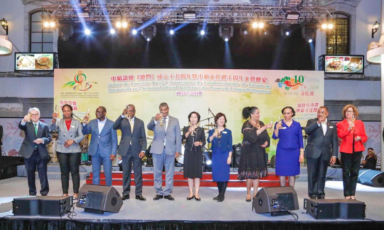 “中葡论坛(澳门)成立十五周年”暨“中葡文化周十周年”文艺晚宴于10月16日在澳门渔人码头励骏广场举行。中葡论坛(澳门)常设秘书处徐迎真秘书长与中央人民政府驻澳门特别行政区联络办公室经济部李华英副部长兼贸易处负责人、莫桑比克工业和贸易部长Dr. Ragendra de Sousa、各葡语国家驻华使节、驻澳门总领事等出席祝酒仪式。出席嘉宾还包括参与文化周协办单位代表以及中国与葡语国家艺术团体、澳门工商界和各社团代表等。