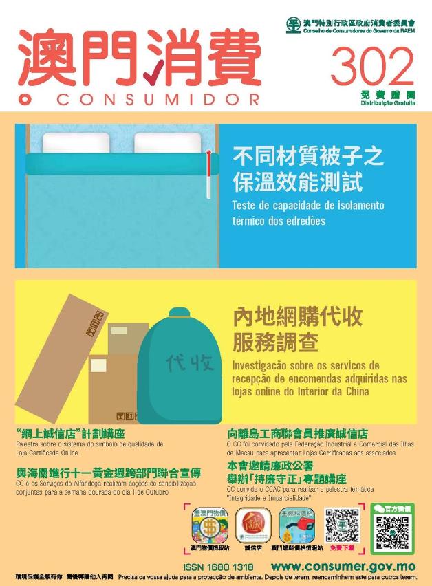 消费者委员会出版的第302期《澳门消费》刊载抽查被子效能及调查内地网购代收平台服务两份报告,消费者可登入消委会网站(www.consumer.gov.mo)浏览,透过报告全面的分析,能够在选购有关商品及服务时有更多的参考资料。