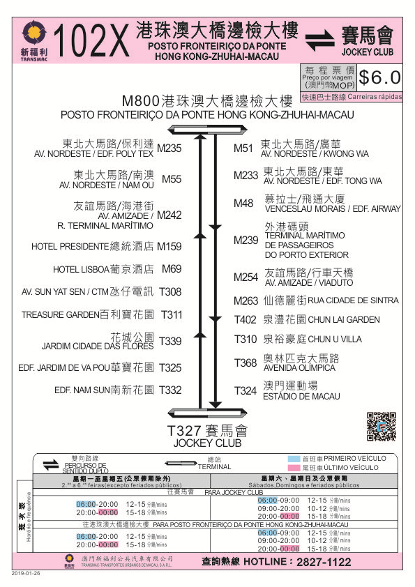 随着港珠澳大桥澳门口岸出入境人流增多,交通事务局经检视客流量及营运情况后,由1月26日(周六)首班车起,101X路线新增停靠“青洲/嘉应花园”站、“林茂/信誉湾畔”站及“林茂/澳门游艇会”站;102X路线(往港珠澳大桥方向)则新增停靠“葡京酒店”站;同时,为疏导人流及便利公众,101X及102X路线部份时段加密班次,且102X路线服务时间由原来上午7时至晚上11时延长至上午6时至凌晨12时。