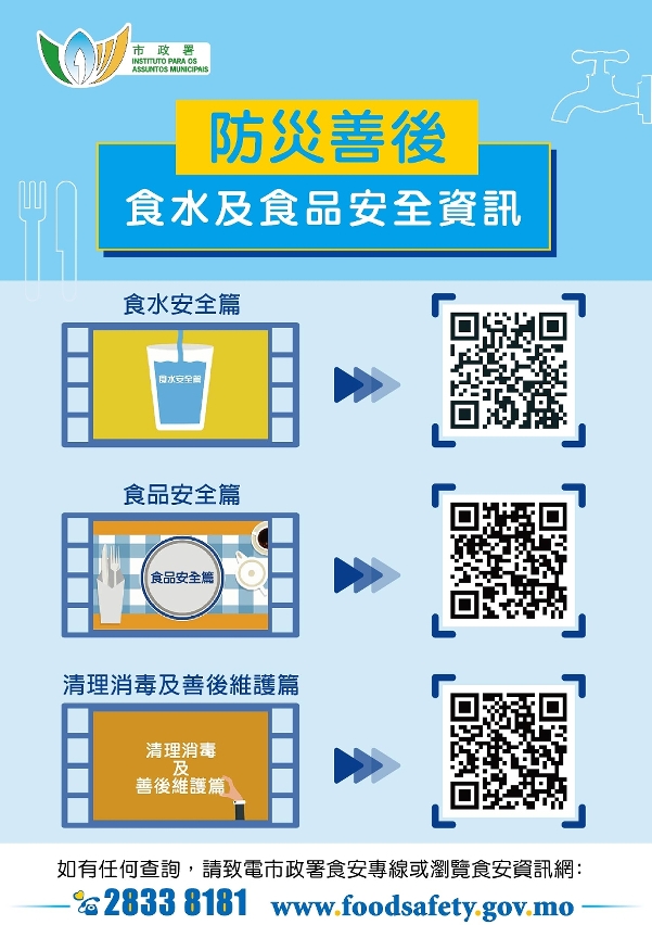 为确保食品安全,市政署将会持续走访商户作宣导教育,并特别编订了图文并茂的《防灾善后食水及食品安全手册》及制作了系列视频短片,藉此教育本澳食品业界及公众尽力完善自主食安卫生管理,防范食源性疾病在社区的爆发,希望持之以恒地推动社会各界从提升防灾避险意识达到防范灾后爆发食安事故。有关指引及指南已上载「食品安全资讯」网页,业界及市民可以透过「食品安全资讯」网页www.foodsafety.gov.mo及「食品安全资讯」App查阅。