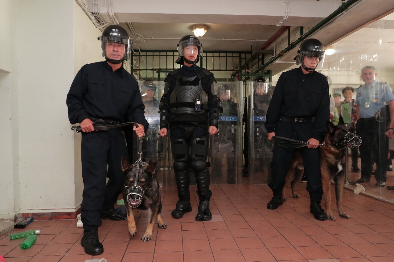 与此同时,治安警特警队、警犬组,监狱防暴队及消防人员迅速赶赴囚仓区,向情绪激动的滋事在囚人发出警告无效后,运用盾牌、推压牌、耳鸣弹及胡椒喷雾,攻入囚室逮捕多名顽强抵抗的在囚人,成功平息暴动,救出4名被挟持的在囚人并将其中1名受伤在囚人送院。