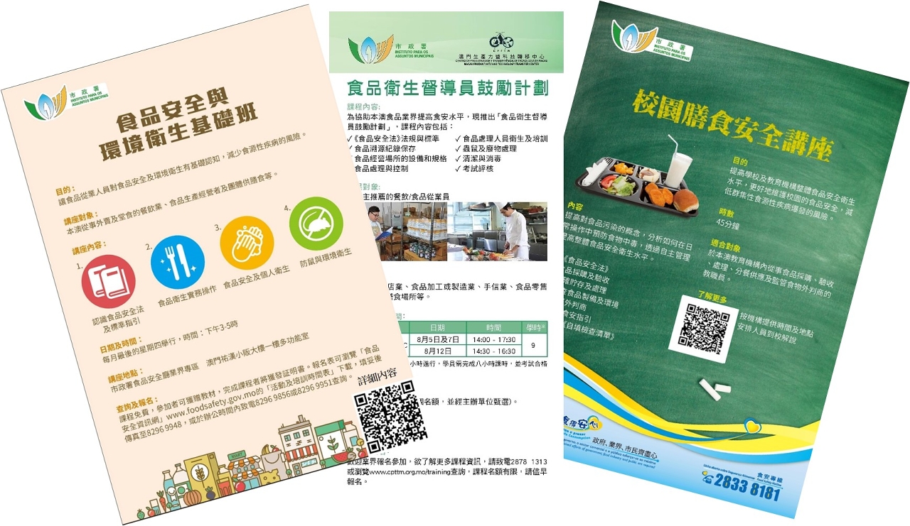 食品业界是食品安全链的重要持分者,市政署将持续加强对业界的食安宣教工作,并适时更新培训内容及举办方式,教育业界切实掌握食安操作知识及要点,并落实到生产经营及生活之中。有意报读或预约组织讲座的人士及机构可登入食品安全资讯网页www.foodsafety.gov.mo下载及填妥报名表格,并透过电邮dir-info@iam.gov.mo、传真8296 9948,或于办公时间递交至佑汉小贩大楼一楼食品业界专区及市政署各区市民服务中心,查询可致电食安专线2833 8181。