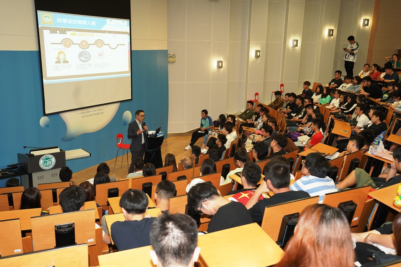 会上,薛仲明局长首先介绍了过去两年本澳发生的电话及网络诈骗案发情况和特征,当中提到有不少年青人尤其是大学生堕入“假冒政府机关人员”的电话骗局而招致损失,他更以最近发生的巨额电话诈骗案为例,生动剖析讲解骗徒的作案手法;与会学生专心聆听薛局长讲解骗徒诱骗年青人步入骗局的过程,纷纷对诈骗集团的精密谋算表现诧异、为受害学生蒙受巨额损失同感惋惜。讲解环节尾声,薛局长语重心长嘱咐在场学生要提高个人保护意识,强调预防犯罪的重要性,并向学生传授防骗诀窍,重申电话及网络诈骗犯罪手法均是大同小异,只要多留意警方发放的防罪资讯,多加警惕,犯罪份子便不易得逞。