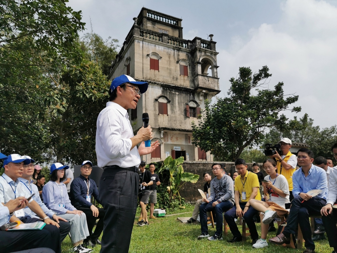 青年参访团首先参观了世界文化遗产地——自力村碉楼群,受到江门市及开平市领导的热情接待,不仅在特色文化展示区欣赏了当地文化工艺,还欣赏了江门青年带来的音乐演奏与现场写生作品。其后,谭俊荣司长以“施政回顾•瞻望湾区”为主题,在自力村最具代表性的铭石楼前与青年真情对话,回顾社会文化范畴的施政措施,并探讨如何培育青年创新创意与合作思维,提升个人竞争力,积极融入大湾区发展。