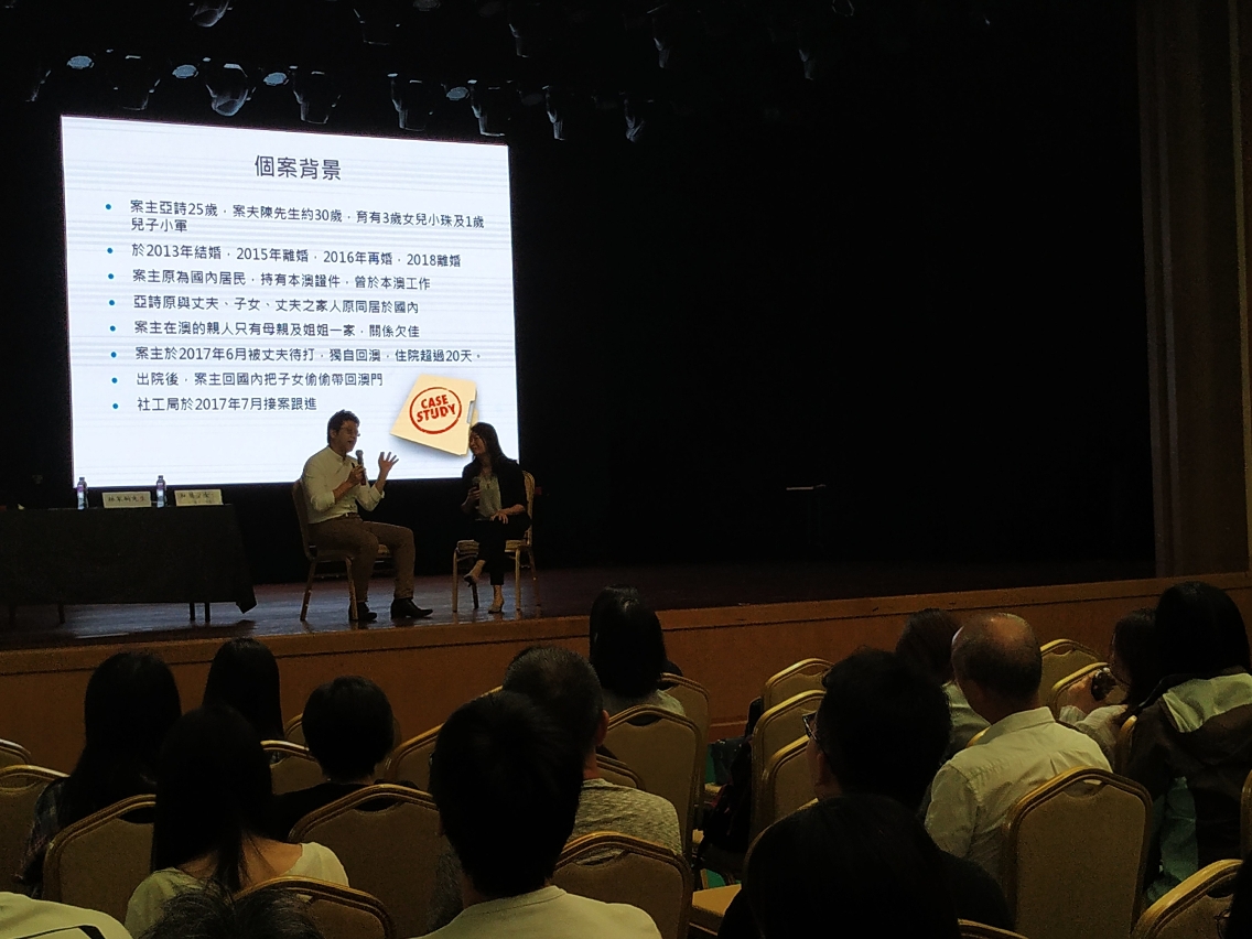 社工局于2019年10月17日在澳门街坊会联合总会大楼礼堂,举办第二场 “处理家暴配偶个案基本训练课程”,邀请了澳门司法警察局代表梁国晞副督察讲解本澳家暴相关的法例及报案流程。另外,香港资深社会工作者林家驹先生讲解家暴配偶的类型、特征、施暴者及受害人的需要,会上由社工局前线资深社工林蔼莹女士作个案分享。本课程有助参加者认识澳门有关法规、制度及社会服务的资源配置,观摩香港处理家暴配偶个案的制度及经验,从而瞭解不同专业人员协作及介入家暴家庭的重要性。课程除了由讲员教授知识外,在互动环节中,亦与参加者交流实务工作及经验。