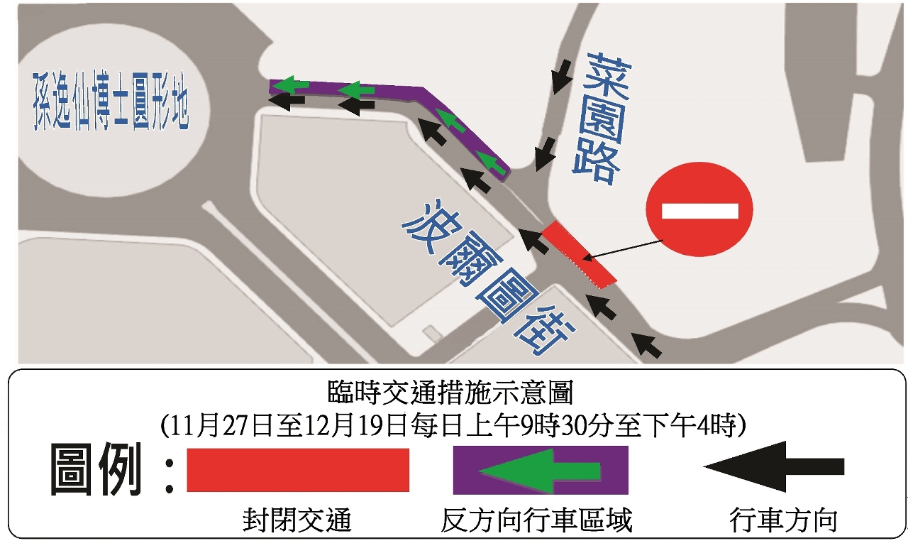 市政署疏通排水管道及维修渠道,11月27日(周三)至12月19日(周四)每日上午9时30分至下午4时,氹仔菜园路与波尔图街交界封闭交通,以及介乎菜园路与孙逸仙博士圆形地之间一段内路实施反方向行车。交通事务局呼吁公众留意。