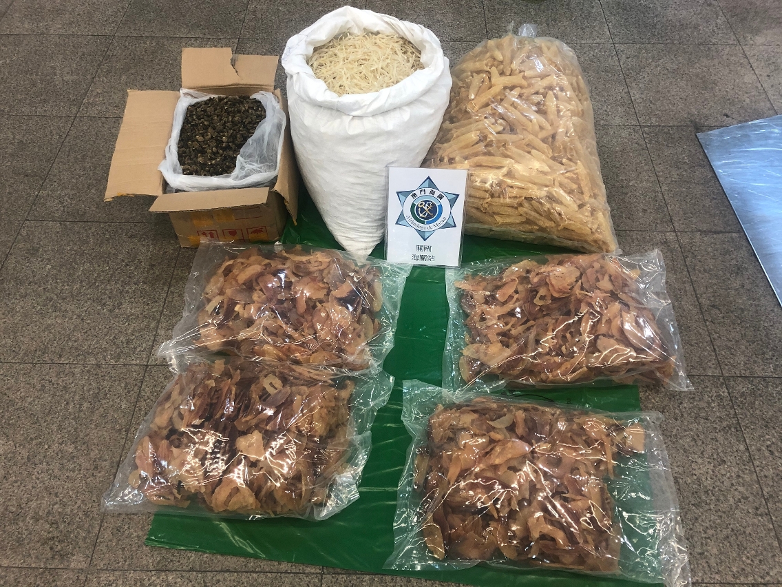 本月26日,一辆粤澳两地牌私家车经关闸口岸车道入境时,被海关风险管理系统判断为需接受详细检查,海关关员进行检查时发现私家车后排座位、车尾箱及地台位置载有大量干货,包括蚝干、花胶、鱼干及干螺片,合共62公斤。上述被检获的物品均未经检疫,且部分物品须预先申领准照方可进口本澳。海关根据第7/2003号法律《对外贸易法》的相关规定,对涉案司机作出起诉,一经判罚,可科处澳门币5千元至10万元罚款,而查获的货物会宣告归澳门特别行政区所有。