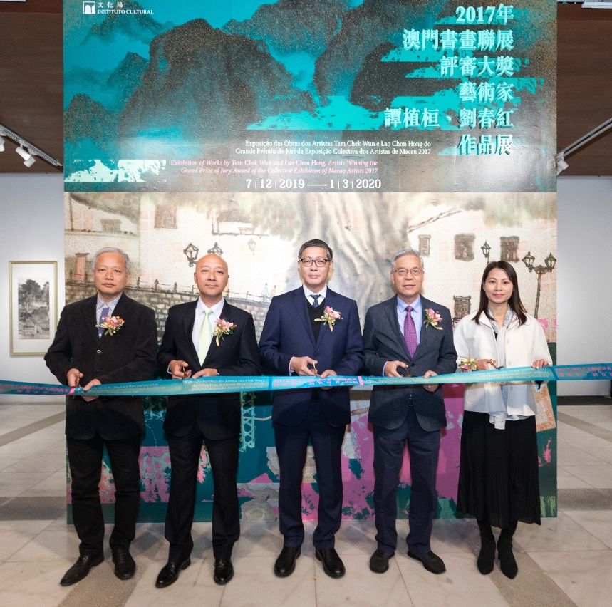 由文化局主办的“2017年澳门书画联展评审大奖艺术家谭植桓、刘春红作品展”今日(12月6日)在龙环葡韵汇艺廊举行开幕式,文化局副局长陈继春、澳门美术协会会长陆曦、澳门颐园书画会常务副会长萧春源,以及是次参展本地艺术家谭植桓及刘春红主礼,场面热闹。