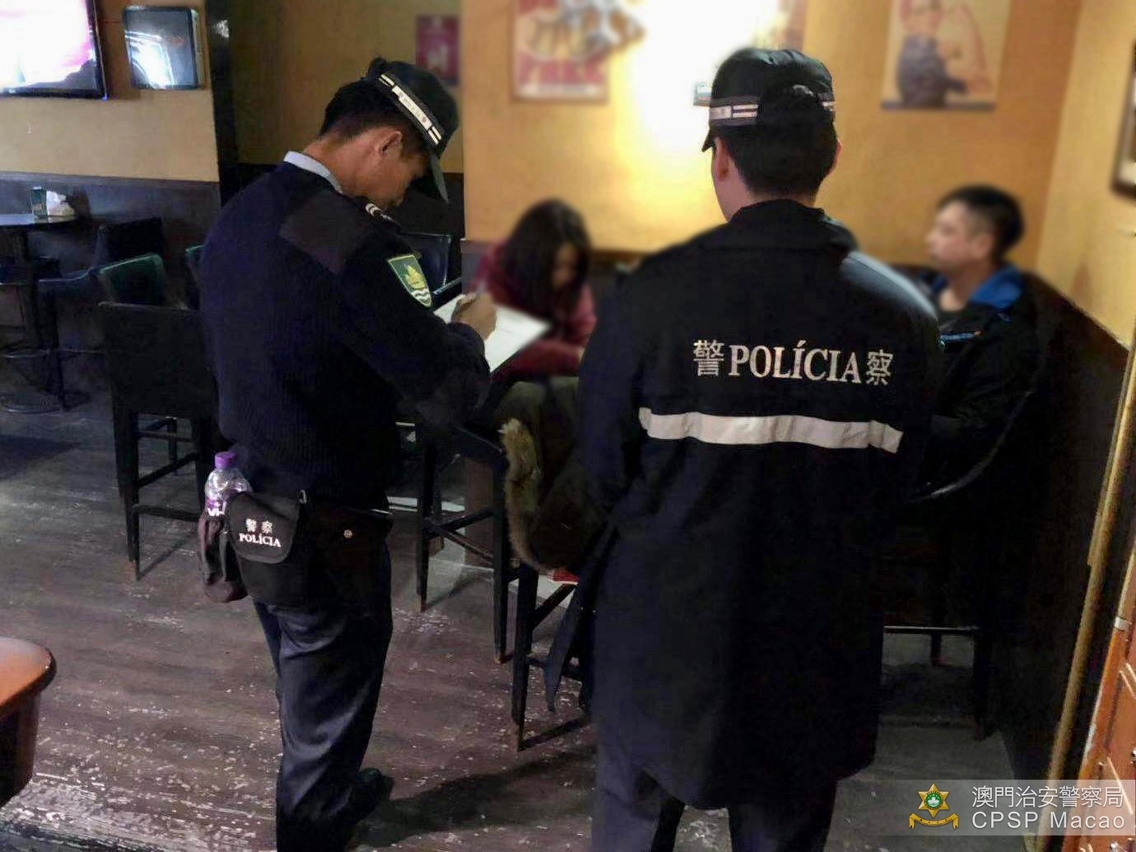 治安警察局持续展开反罪恶巡查行动,确保本澳社会安宁及公共秩序安全。于12月9日,本局澳门警务厅及海岛警务厅共派出19名人员,分别于新口岸及南湾一带巡查多间娱乐场所、酒店及宾馆,以及氹仔市区巡查多间酒吧,打击各种不法行为。此外,情报厅人员于新桥区巡查一个怀疑提供色情按摩的单位。 行动中一共截查37人(27男10女),其中2名女子因提供色情按摩,涉嫌非法工作,已被送交相关部门作跟进。