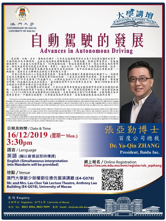 澳门大学将于12月16日(星期一)办“大学讲坛”讲座,由百度公司总裁张亚勤博士以“自动驾驶的发展”为题发表演说。张亚勤将从技术、行业和政策等角度讲述自动驾驶带来的历史性机遇和挑战,欢迎有兴趣人士参加。