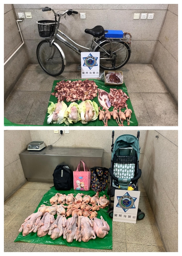 海关持续加强对入境车辆及旅客的检查工作,以打击各类型不法活动。本月11及14日,海关于关闸口岸先后截获两宗走私食材案,合共查获63.3公斤未经检疫食材,同时扣押一部未具备入口申报文件的电动单车,海关已依法对涉案人士作出起诉。