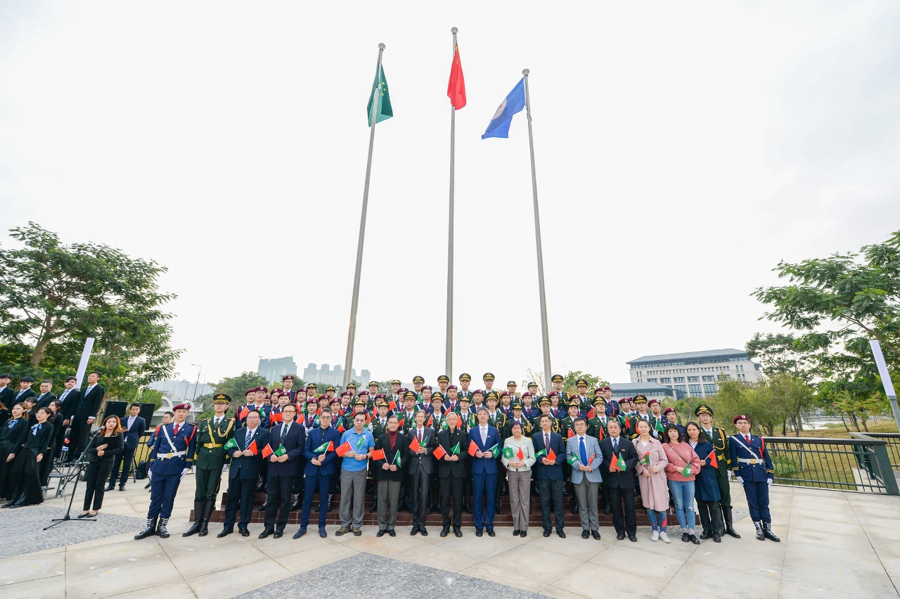 早上8时正,由澳门大学国旗仪仗队、清华大学国旗仪仗队、浙江大学宁波理工学院国旗护卫队组成的升旗方队穿着整齐的制服,迈着铿锵的步伐,走向升旗台。当澳大管乐团奏响起国歌时,三校队员同时把国旗、区旗和澳大校旗抛向蓝天,冉冉升起。