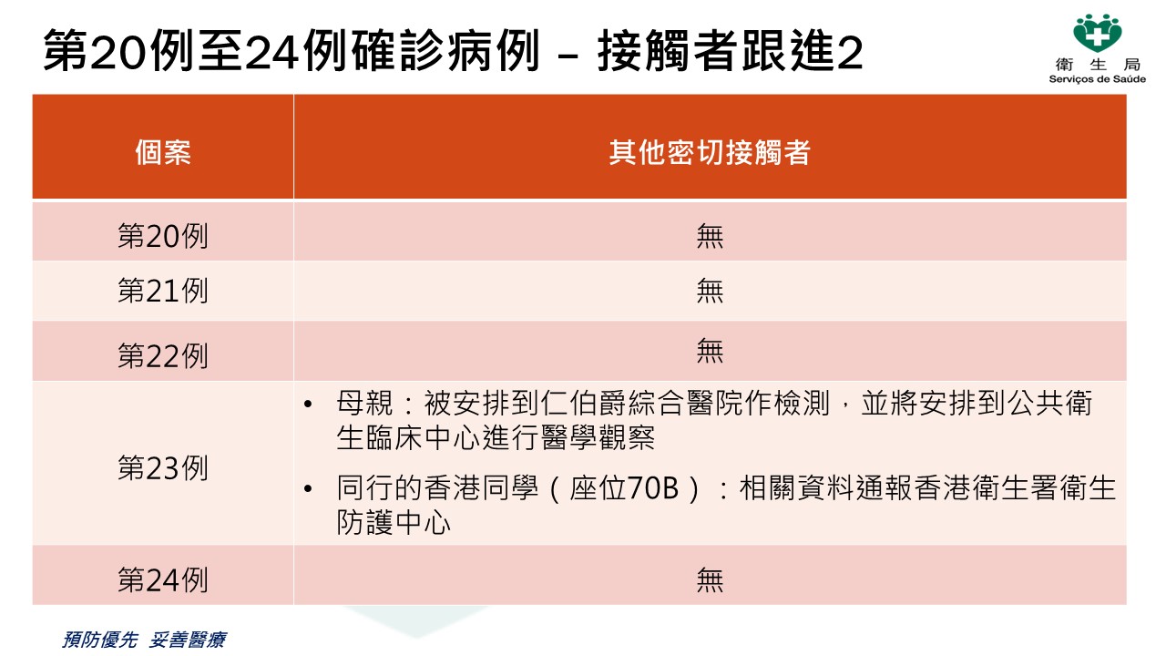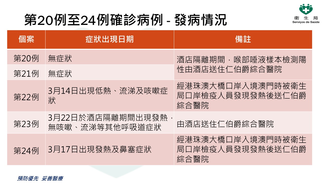 新型冠状病毒感染应变协调中心今(23)日表示,过去24小时本澳新增5例新型冠状病毒肺炎确诊病例,累计24例确诊病例。