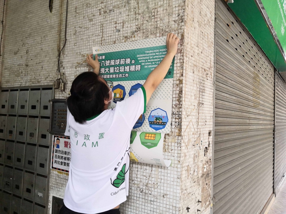 本澳进入风雨季,为加深大众对市政署在八号风球前后所开展有关环境卫生工作的认识,市政署联同坊会开展宣导工作,向低洼地区的商户及市民派发宣传单及张贴宣传海报。并加强与坊会的沟通及协调,提升风后的联动及善后效率。
