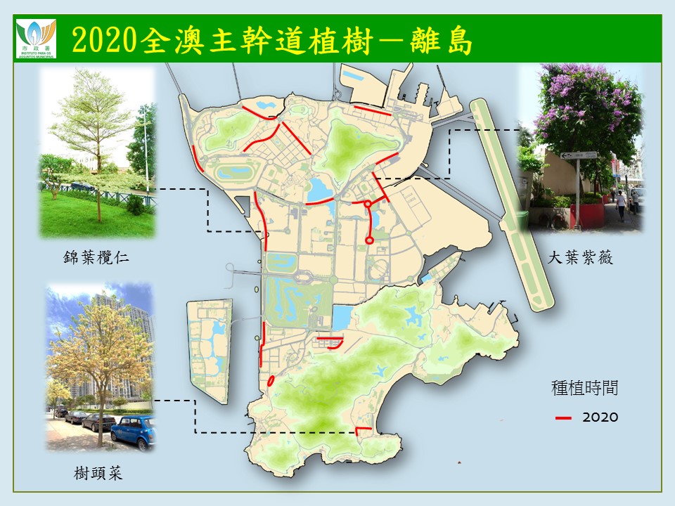 二零二零年主干道植树计划现已有序展开,计划共种植约一千八百株树,已种植地点包括望德圣母湾大马路、霍英东博士大马路,体育馆大马路及广东大马路等。下半年将继续在马度博士大马路、四月二十五日前地、马场北大马路至友谊桥大马路、孙逸仙大马路及休憩区、氹仔轻轨沿线、北安大马路至伟龙马路、机场大马路、体育馆大马路、莲花海滨大马路、黑沙马路、贾梅士大马路及石排湾公屋群周边道路种植树木。